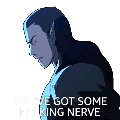 Vax'ildan from The Legend of Vox Machina reacts with a stern look, saying, 'You've got some f***ing nerve.'