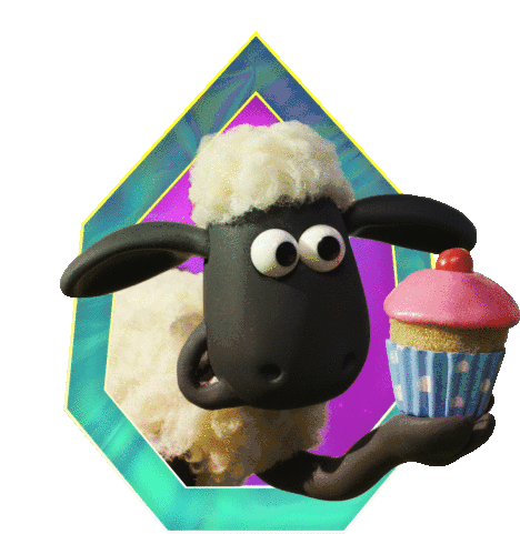 Shaun the Sheep happily holds a pink cupcake with a cherry on top, surrounded by hearts and the word "YUM".