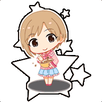 Chibi Yumi Aiba from Idolmaster, happily stirring a bowl of chocolate, surrounded by stars. A cute animated sticker.