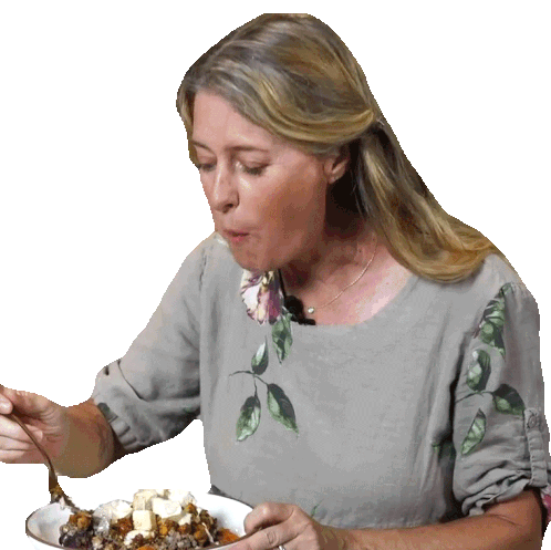 Jill Dalton savors a delicious plant-based meal, nodding in enjoyment. Her expression shows pure satisfaction.