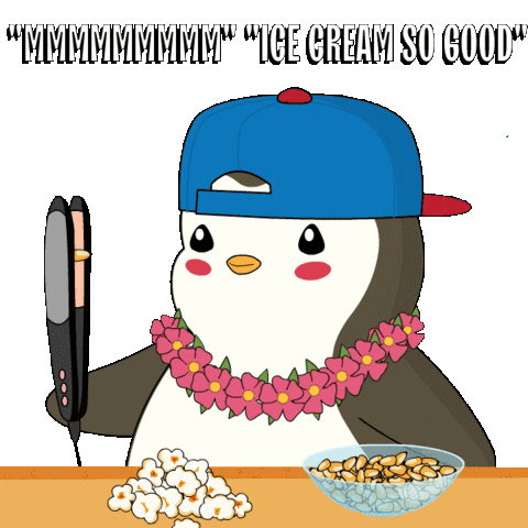 A cute penguin wearing a lei and a cap, holding a hair straightener to pop popcorn, with 'Ice Cream So Good' text.