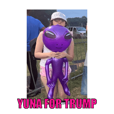 Yuna Coffman holds a purple inflatable alien balloon with 'YUNA FOR TRUMP' text, showing support for the political campaign.