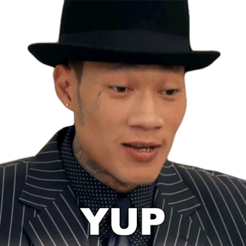 Steven Somwon gives a subtle "Yup" while wearing a fedora and a pinstripe suit, with a slight smirk.