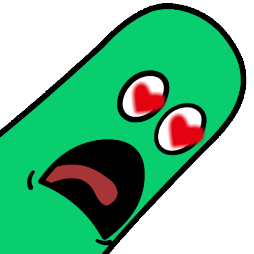 Yup Yupforreal, the green character with heart eyes, wiggles with adoration and love.