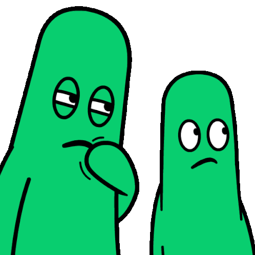 Two green cartoon characters, one looking tired and the other concerned, engaged in a quiet conversation.