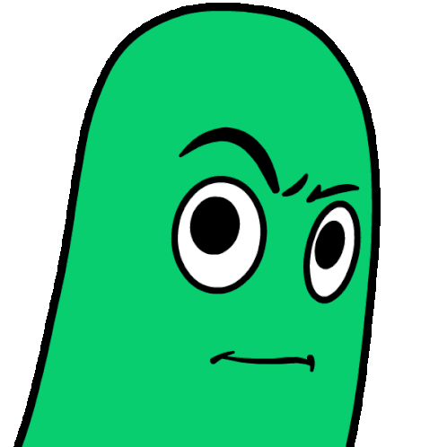 A green cartoon character gives a skeptical side eye, with one eyebrow raised and a knowing smirk, embodying a 'yupforreal' attitude.