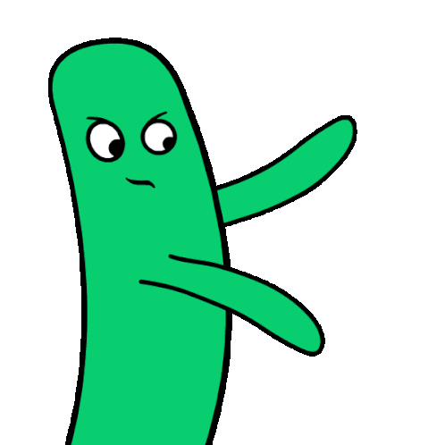 A green cartoon character with an angry face and pointing arms, expressing suspicion and accusation.