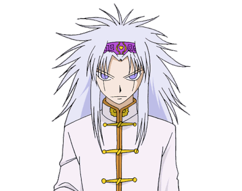 Wonrei from Zatch Bell, with white hair and a purple headband featuring a distinctive 'o' design, pointing forward.