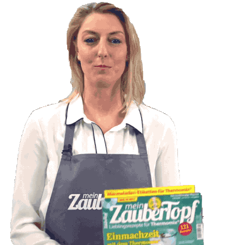 A woman smiles while holding the German cooking magazine 'Mein ZauberTopf', featuring Thermomix recipes.