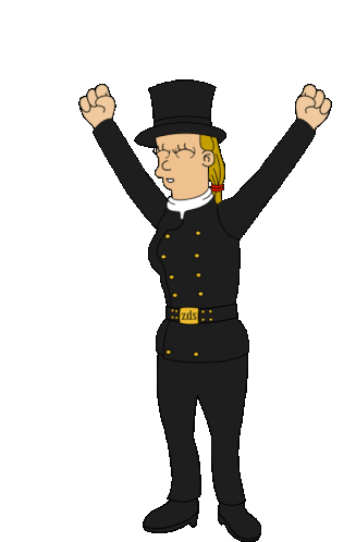 A cheerful Zds character, dressed as a chimney sweep in a top hat and black uniform, sways happily.