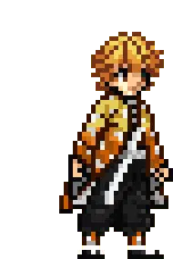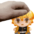 Zenitsu Agatsuma from Demon Slayer in pixel art style, gently patting a small yellow creature, featuring 'Tilin De Ann'.