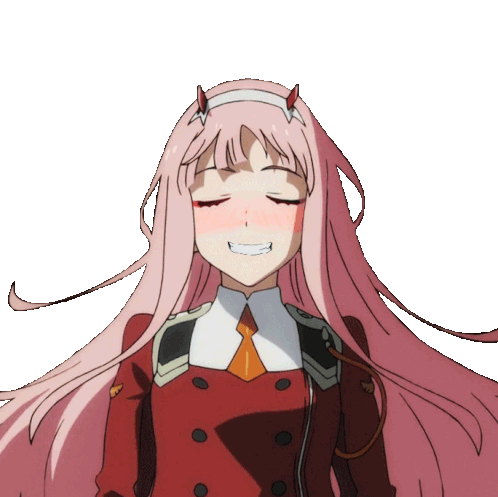 Zero Two, the anime character with pink hair and horns, smiles happily with blushing cheeks, conveying a cheerful and agreeable mood.