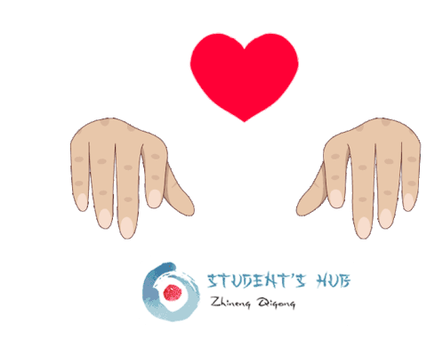 Animated hands performing a Zhineng Qigong movement, sending healing Qi with a red heart, featuring the Student's Hub logo.