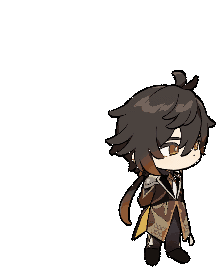 Zhongli, the Geo Archon from Genshin Impact, is depicted as a cute pixel art chibi character, rotating gently on a transparent background.