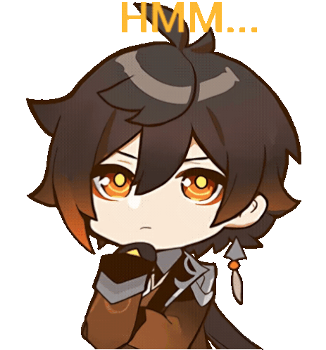Zhongli from Genshin Impact ponders with 'HMM...' above his head, showing a thoughtful or confused expression.