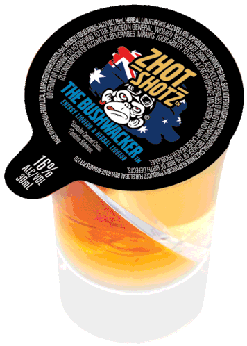 Zhot Shotz The Bushwacker, an energy and herbal liqueur shot, featuring a monkey logo and Australian flag design.