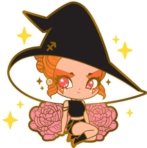 Cute Sagittarius witch sticker with sparkling eyes, a zodiac hat, and surrounded by stars and flowers.