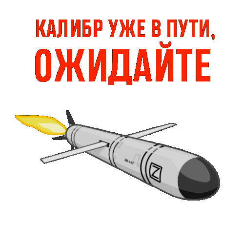 A Kalibr missile with a 'Z' symbol flies, accompanied by the Russian text 'Kalibr is already on the way, wait'. Features Plam4ek and ZOV.