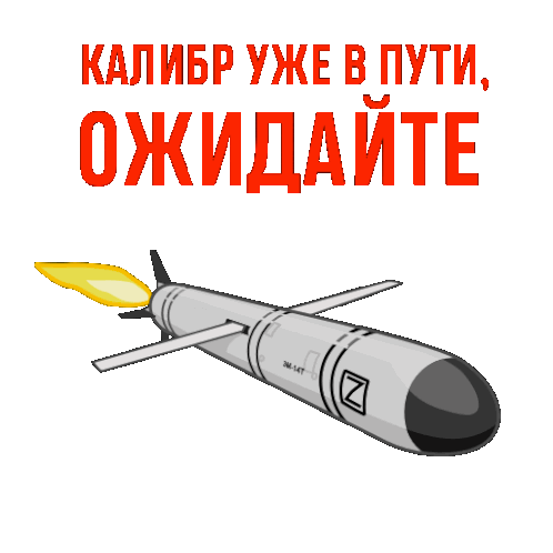 Animated sticker featuring a Kalibr cruise missile with the 'Z' symbol, warning 'Kalibr is already en route, expect it'.