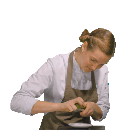 A female chef skillfully zests a fresh lime, then looks up with a friendly smile, showcasing culinary skill.